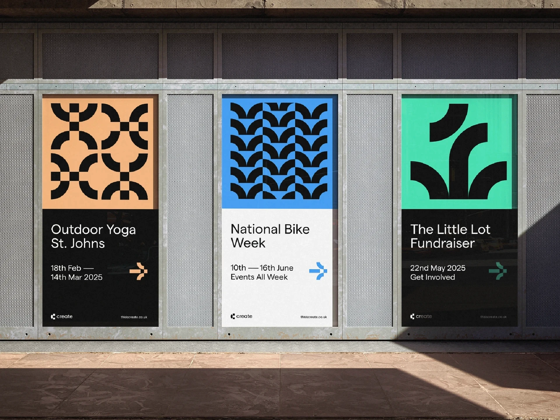 The logo is built on a geometric grid. An arc inspired by classical amphitheatres sits alongside square forms rooted in Form's architectural identity. Together they represent the combination of community and built environment that defines Create's approach to placemaking. We delivered the full visual identity. Copywriting was handled in collaboration with W4E Ltd. Agency: To The Summit.